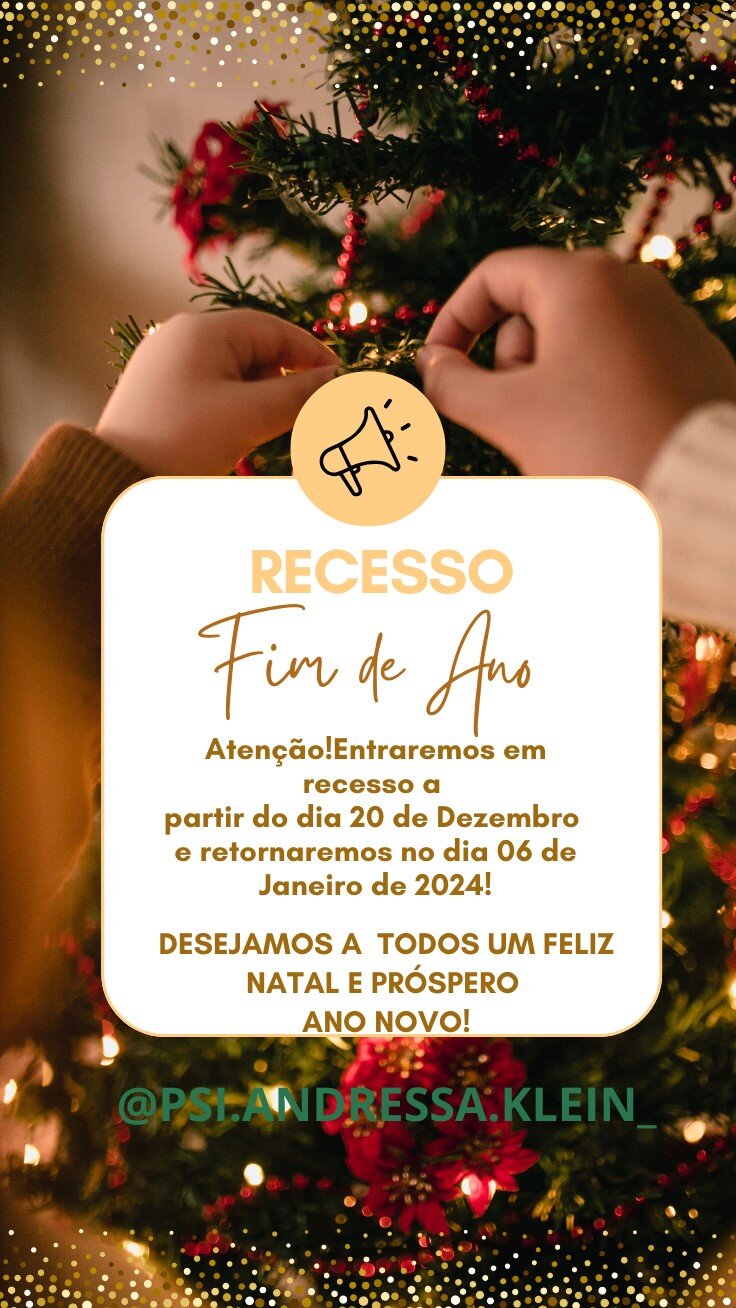 Estimados pacientes informo que estarei de recesso de final de ano de 20 dezembro ao dia 05 de janeiro. Retornaremos aos atendimentos normais no dia 06 de janeiro de 2025. Desejo a todos um lindo e abençoado Natal e um Feliz Ano Novo!